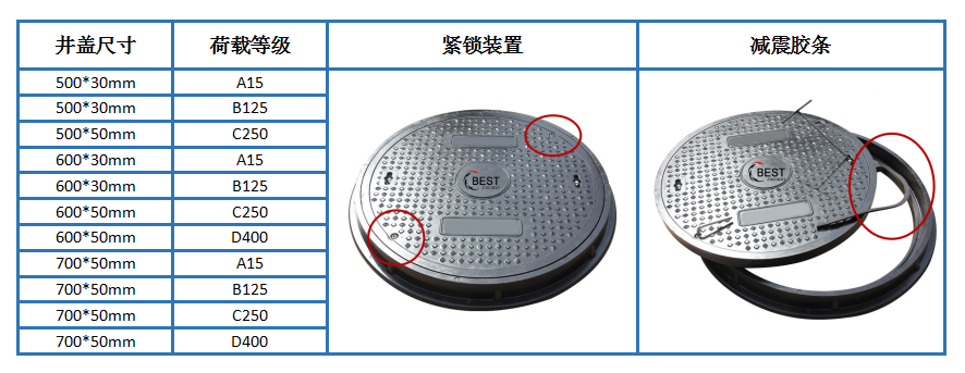 上圖所示,我們?cè)诰w上設(shè)計(jì)了緊鎖裝置和減震膠條,過(guò)車時(shí)不起蓋、不跳蓋、無(wú)噪音,井蓋的提孔更是采用非通孔設(shè)計(jì),防止雨水等垃圾進(jìn)入破壞井內(nèi)的設(shè)備,而且樹(shù)脂井蓋沒(méi)有任何回收利用價(jià)值,不會(huì)有偷盜現(xiàn)象發(fā)生,耐酸堿腐蝕、防靜電等特點(diǎn)更是很多傳統(tǒng)的鑄鐵井蓋無(wú)法滿足的,在保障路面交通安全的同時(shí)還提高了行車舒適度,這樣有實(shí)用性的井蓋才值得推廣使用!
